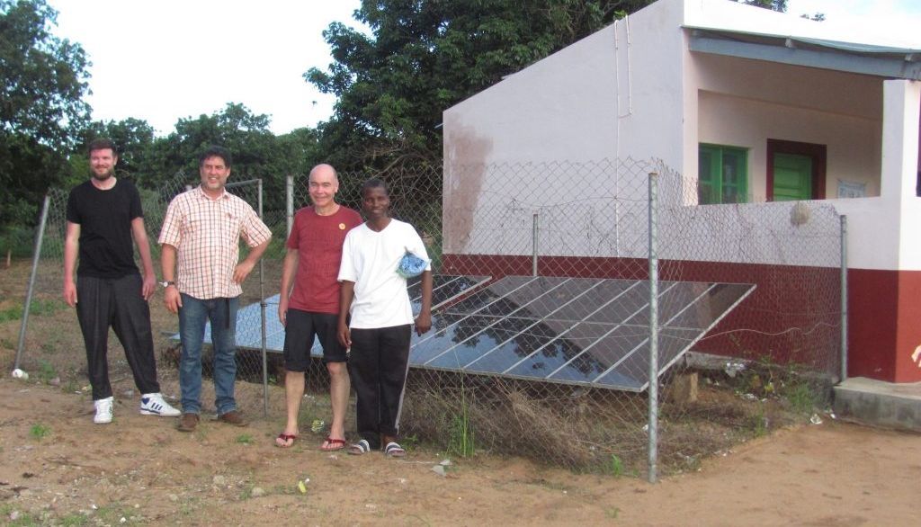 Michael Hildebrand, Klaus Rothermel, Andreas Stemberg und Pedro dos Santos Mahumane (v.li.) vor den neuen Solarmodulen einer Entbindungsstation. Die Module versorgen eine Kühlung für Impfstoffe