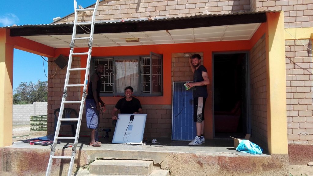 Dorfbewohner Sefelito unterstützt Klaus Rothermel und Michael Hildebrand (v.li.) bei der Solarmodul-Montage für das Waisenhaus von Cambine in Mosambik